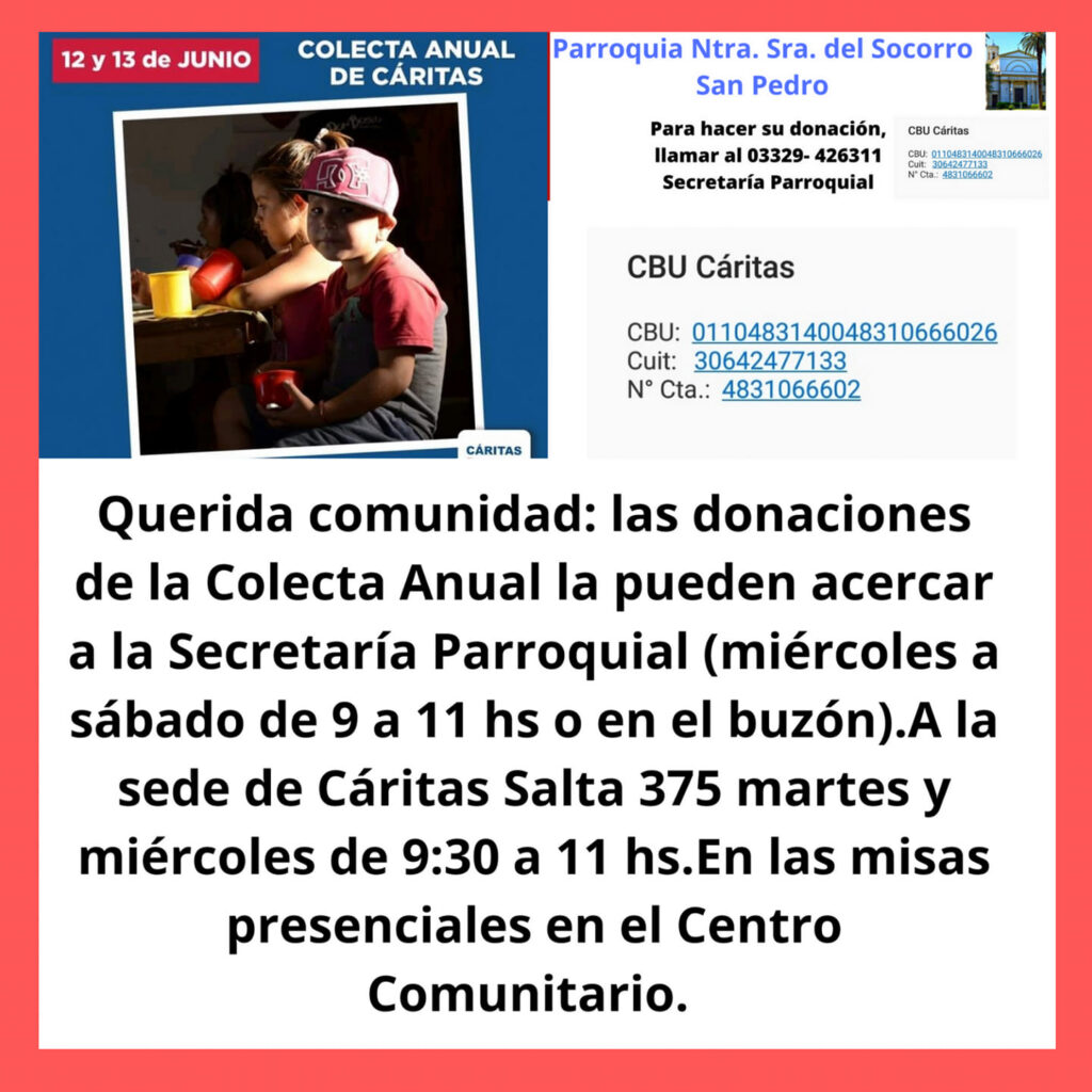 Según informaron desde la Parroquia Nuestra Señora del Socorro este sábado 12 y domingo 13 de junio se realizara la tradicional colecta anual y se informo a través de redes sociales que las personas que quieran pueden acercar a retirar un sobre a la Secretaria Parroquial o realizar una transferencia bancaria a la cuenta de caritas CBU CARITAS: 0110483140048310666026 – CUIT: 30642477133 – NUMERO DE CUENTA: 4831066602
