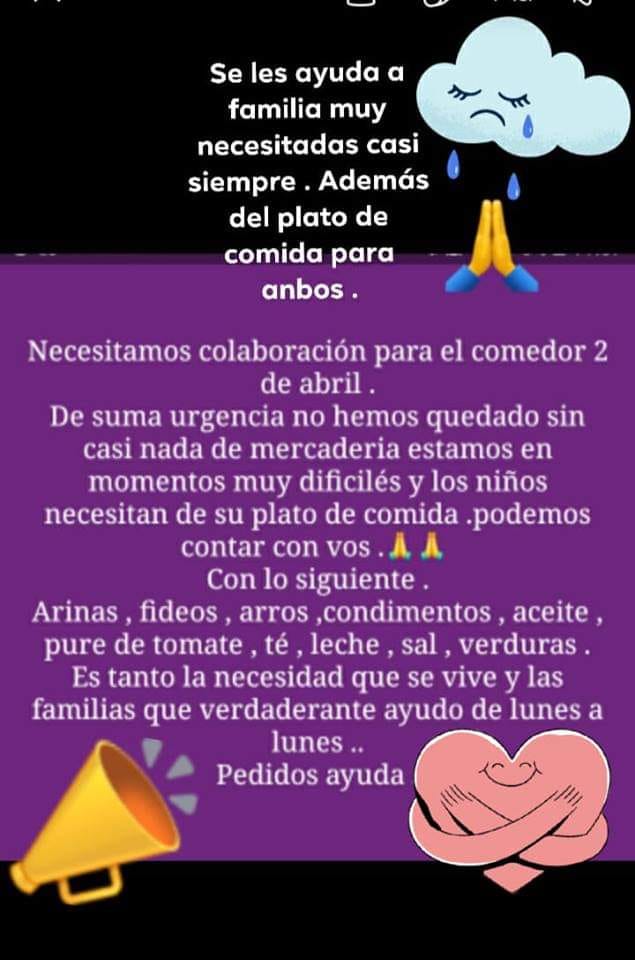 “Si no abrimos, no comen, me llaman de afuera de mi casa”, explica con angustia con respecto al posteo que realizo este día lunes en su red social facebook donde un chiquito la llamaba que quería pan.