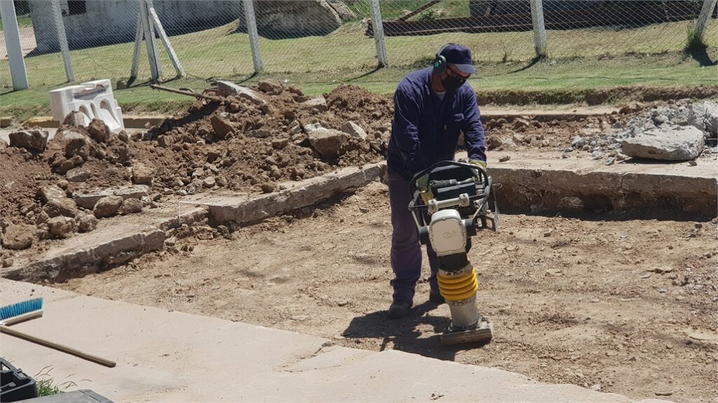 Se trabaja en la repavimentación de una superficie aproximada de unos 150 metros cuadrados, para retirar el pavimento de hormigón existente y dañado, compactar la base de suelo seleccionado (con aporte de suelo si es necesario) y realizar un nuevo pavimento de hormigón de 0.20 m de espesor.
