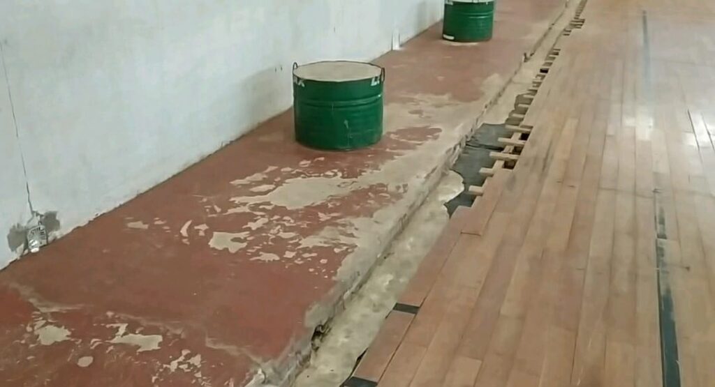 En el caso del gimnasio sobre el que se proyectan varias reformas, se resolvió preservar la mayor parte de los 1230 m2 del piso de parquet original y realizar reparaciones puntuales para no perder la amplia superficie que se encuentra en condiciones y que iba a ser reemplazada por un vinílico.