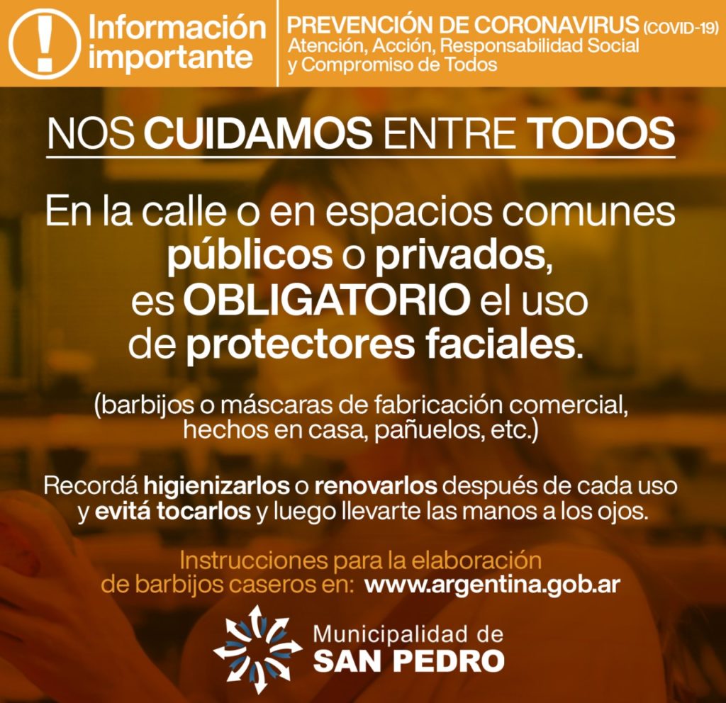 La Municipalidad de San Pedro informa que desde las 00 hs del viernes de 10 de abril, será obligatorio en el Partido de San Pedro, el uso de una cobertura para nariz y boca.