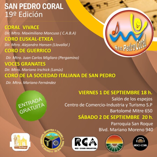 La 19° edición de San Pedro Coral comenzará el viernes 1 de septiembre en el Salón de los Espejos. El Centro de Comercio Industria y Turismo de San Pedro se enorgullece al auspiciar y compartir esta invitación abierta a todos los sampedrinos para presenciar los conciertos programados en esta edición. El evento se llevará a cabo durante dos días consecutivos, el viernes 1° y el sábado 2° de septiembre, con entrada libre y gratuita, y contará con la participación de agrupaciones corales de diferentes lugares de Argentina.