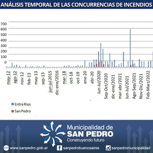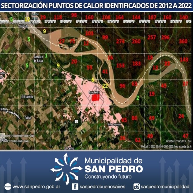Desde la Dirección de Ambiente se lleva a cabo la tarea de identificar las viviendas en zona de isla para establecer, a través de un trabajo integral de campo, el grado de riesgo de las mismas y generar vínculos que permitan la identificación de los habitantes de esos sectores para llevar a cabo un diagnóstico que determine prioridades de acción. Además, se realizó un análisis de los últimos diez años de concurrencias de incendios en la región, dado que San Pedro se vio afectado en muchas ocasiones por los incendios que ocurren en la provincia de Entre Ríos, determinando que, en un total de 5047 focos ígneos, el 88% ocurrieron en jurisdicción de la provincia vecina y el 12% en nuestro Partido, siendo el período de agosto a octubre donde se generan la mayor cantidad de quemas.
