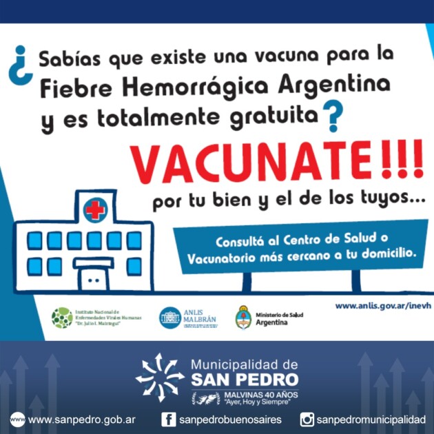 Se recuerda que están disponibles en los Centros de Salud y Hospitales la vacunas contra la Fiebre Hemorrágica Argentina, una enfermedad infecciosa endémica en el noroeste de la provincia de Buenos Aires, sur de Córdoba, sur de Santa fe y norte de La Pampa.