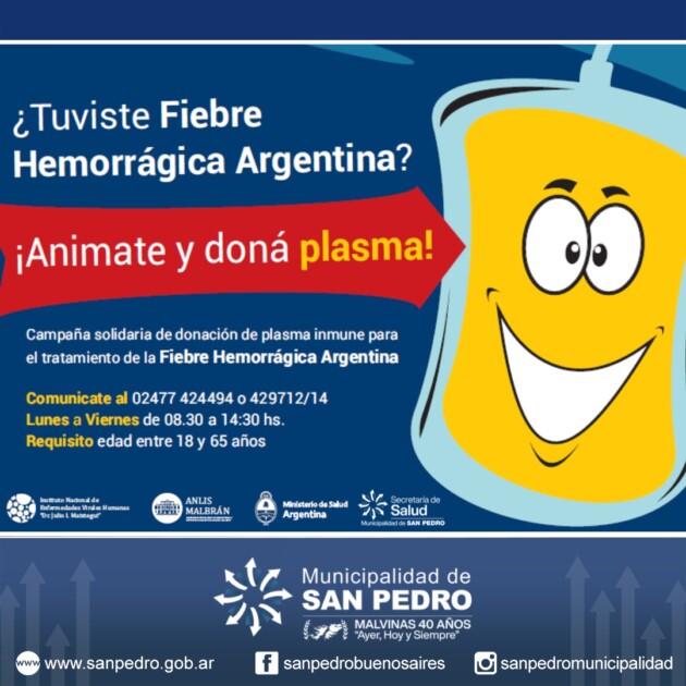 En el marco de la campaña que lleva a delante la Secretaría de Salud de la Municipalidad de San Pedro contra la Fiebre Hemorrágica Argentina (FHA), se informa a quienes hayan transitado la enfermedad que se pueden sumar a la campaña solidaria de donación de plasma para el tratamiento de la FHA.