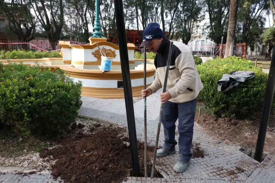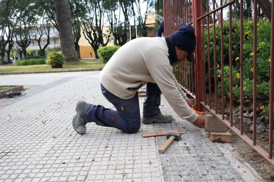 Al mismo tiempo, se trabaja en la colocación de nuevas rejas perimetrales en la fuente central de la plaza. Esta medida busca prevenir hechos de vandalismo y conservar el patrimonio público, asegurando que todos los vecinos y visitantes puedan disfrutar del espacio en condiciones óptimas.