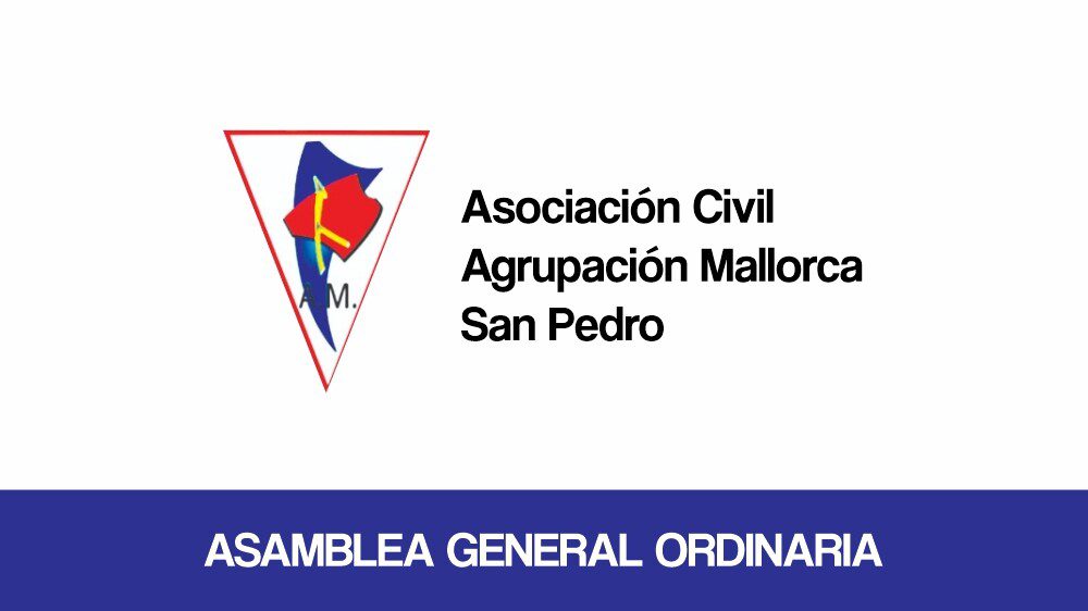 De acuerdo a lo dispuesto en nuestros estatutos constitutivos, convocase a los Sres. Socios de la Asociación Civil Agrupación Mallorca San Pedro a la ASAMBLEA GENERAL ORDINARIA Ejercicio nº 9 – 2024. La misma tendrá lugar en la Sede Social ubicada en Av. España 575, de la ciudad de San Pedro, el día jueves 03 de abril de 2025 a las 19:30 h, para tratar el siguiente: