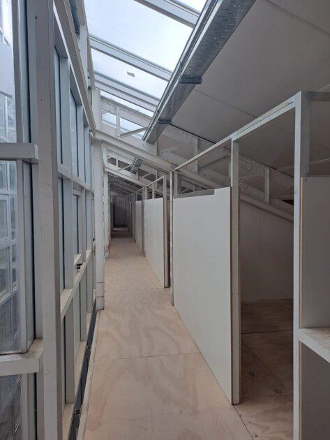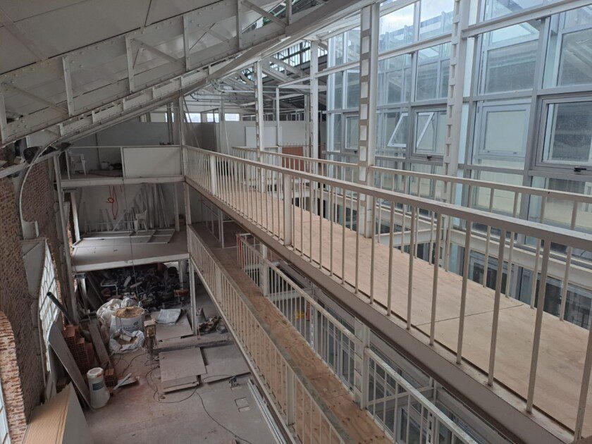 La obra del futuro Salón Comunitario, que será la nueva sede administrativa de Coopser, continúa avanzando. En esta etapa, se instalan divisores de oficinas con bastidores metálicos enchapados en melamina, distribuidos en distintos niveles del edificio.