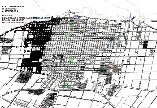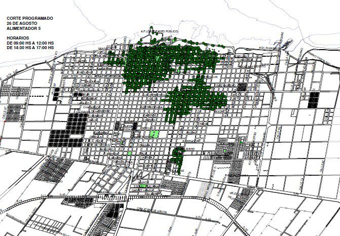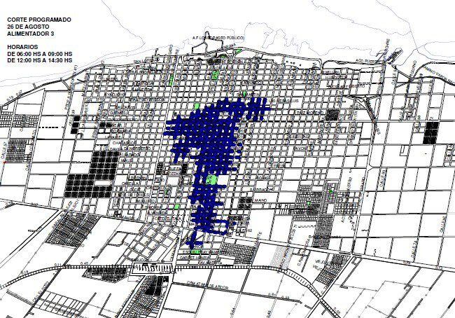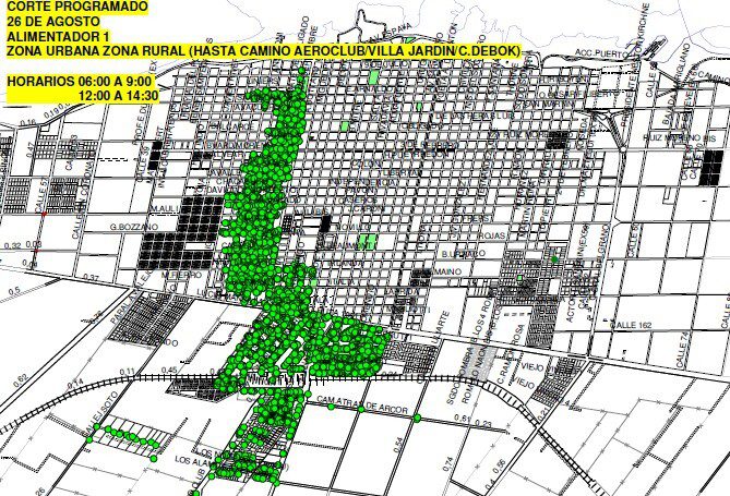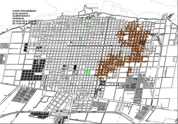 COOPSER ha publicado mapas estimativos con los sectores afectados y los horarios aproximados. Algunos sectores tendrán dos franjas horarias sin suministro eléctrico.