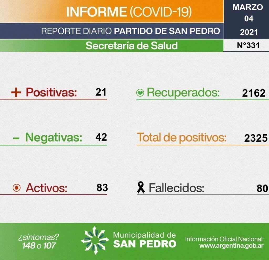 La Secretaría de Salud de la Municipalidad de San Pedro brinda el informe que acompaña la placa del día de la fecha, en el seguimiento de la Pandemia de Covid-19.