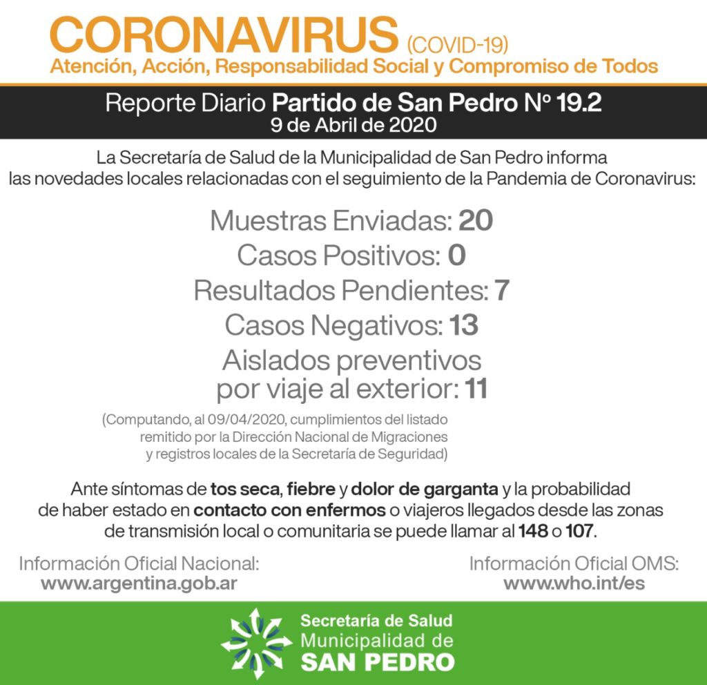 La Secretaría de Salud de la Municipalidad de San Pedro informa las novedades locales relacionadas con el seguimiento de la Pandemia de Coronavirus: