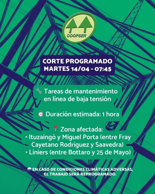 La Cooperativa de Servicios Públicos, COOPSER, anunció un corte programado de suministro eléctrico para este martes 14 de abril, debido a la realización de tareas de mantenimiento en una línea de baja tensión.
