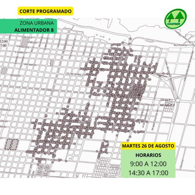 COOPSER anunció cortes programados de energía eléctrica en San Pedro este martes 26 de agosto debido a tareas de mantenimiento anual que llevará adelante TRANSBA sobre la línea de alta tensión de 132 kV San Pedro – Papel Prensa.