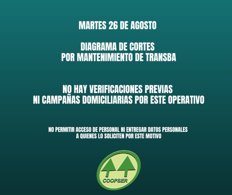 Asimismo, se informó que en caso de mal tiempo los trabajos serán reprogramados, y que las empresas y grandes consumidores ya están siendo notificados individualmente. También se recordó que BCOOPSER no realiza comunicaciones ni solicitudes a través de mensajes o llamadas a los socios, por lo que se recomienda desestimar cualquier contacto de este tipo.