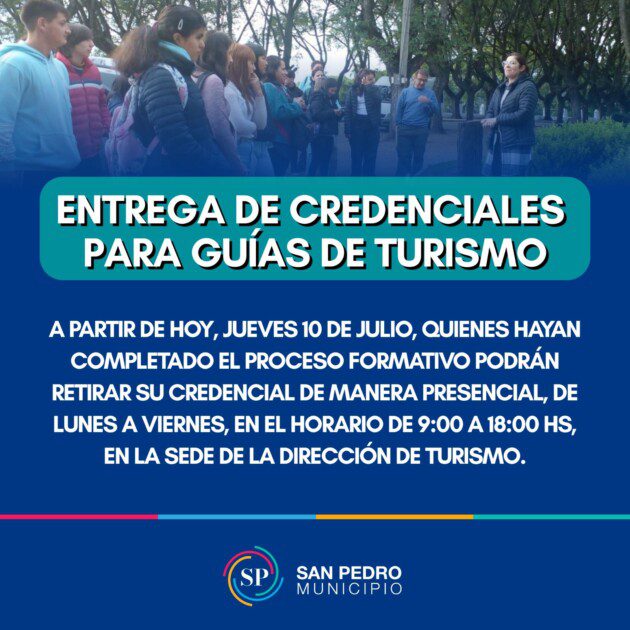 La Municipalidad de San Pedro, a través de la Dirección de Turismo dependiente de la Secretaría de Turismo, Cultura, Deporte y Educación, informa que ya están disponibles las credenciales para los Guías de Turismo que participaron de las capacitaciones realizadas en la Casona de Mitre y Liniers.