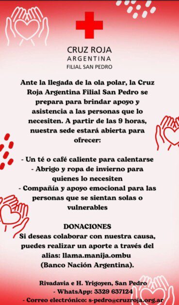 La filial local de Cruz Roja Argentina se prepara para brindar asistencia a la comunidad ante el pronóstico de una ola polar que afectará la región en los próximos días. A partir de las 9:00 horas, la sede ubicada en Rivadavia e Hipólito Yrigoyen abrirá sus puertas para ofrecer servicios esenciales a quienes lo necesiten.