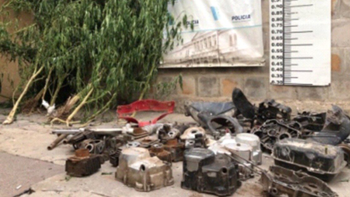 Una vez determinada la responsabilidad en el incidente, los agentes llevaron a cabo un allanamiento que resultó en el decomiso de diversas piezas de motocicletas sin numeración. En el mismo sitio utilizado como desarmadero, se encontraron y confiscaron dos plantas de marihuana con una altura de dos metros.
