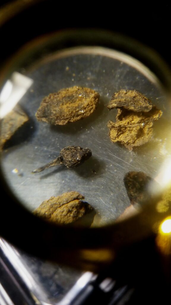 Luego de minuciosas tareas de limpieza efectuadas a dichos sedimentos, las muestras fueron observadas a través de lupas especiales y bajo condiciones de luminosidad particulares que permitieron la detección de varias semillas, dos espinas, pequeñas ramificaciones y numerosos fragmentos de corteza de árboles y arbustos.