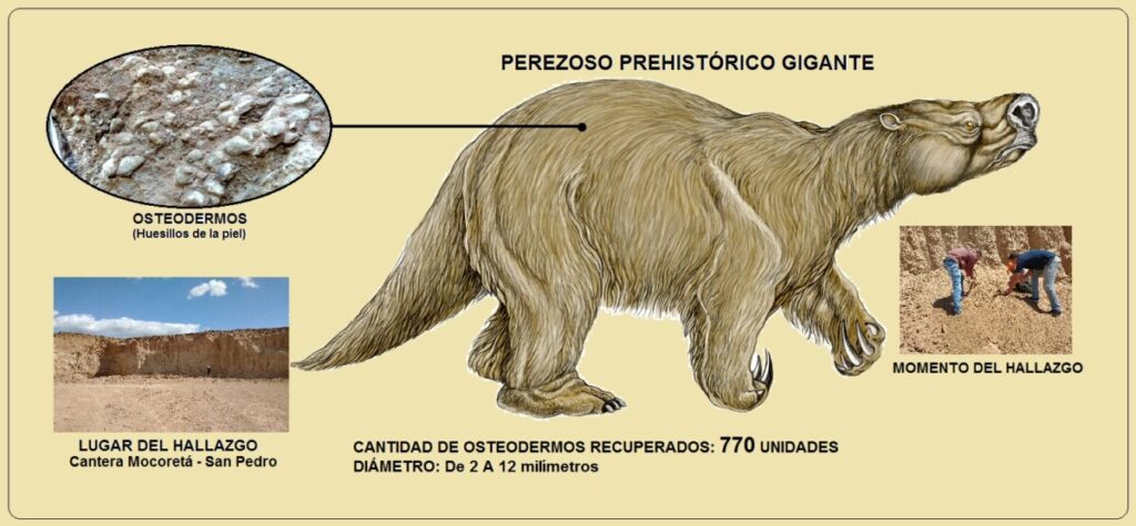 Una importante cantidad de pequeños huesitos dérmicos que reforzaban la piel de ciertos perezosos gigantes fue descubierta en una cantera de extracción de tosca luego de una prospección de rutina realizada por integrantes del Museo Paleontológico de San Pedro, a 170 km de Buenos Aires.