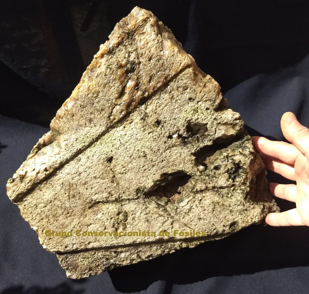 El fragmento hallado por el equipo del Museo Paleontológico pesa unos 50 kilogramos y posee tres surcos bien marcados esculpidos en una roca de aspecto blanco amarillento.