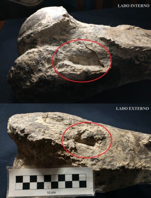 José Luis Aguilar, Director del Museo Paleontológico de San Pedro, comenta que “al ver la primera quebradura con hundimiento, se pensó que podía ser producto del pisoteo de animales. Algún animal con pezuñas podría haber pisado el hueso, después de haber muerto el perezoso. Pero eso se desestimó cuando se observó que en la cara opuesta, había otra herida idéntica.