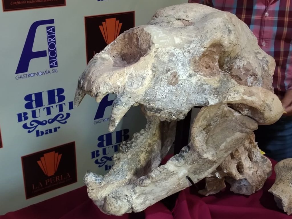 Desde el Museo Paleontológico de San Pedro, Aguilar explica que “el cráneo de esta bestia es asombroso en cuanto a tamaño y estado de conservación. Posee colmillos de 6 centímetros de longitud, fuertes y compactos con los que desgarraba la carne de sus presas. Las mandíbulas están equipadas con otro par similar de 4,5 centímetros de largo. Los molares de estos terribles animales estaban adaptados para cortar tejido muscular y destrozar los huesos de sus víctimas.