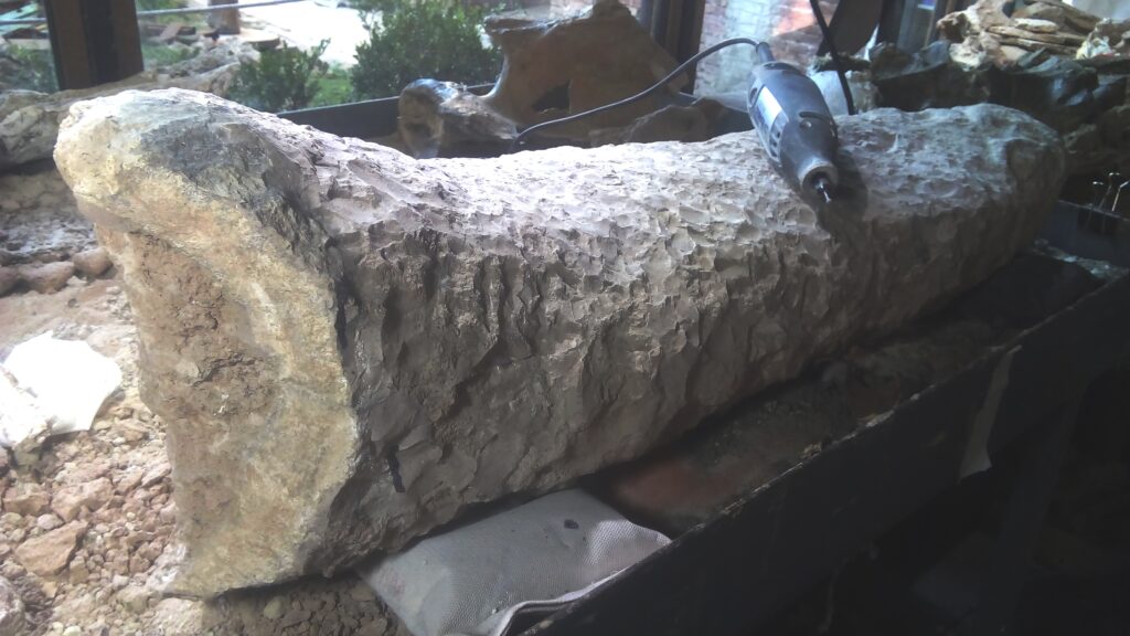 Julio Simonini, integrante del museo, está a cargo de preparar el fósil. De liberarlo de la roca que lo cubre. Según sus apreciaciones “es una pieza con un excelente estado de conservación y gran dureza. Los fósiles que provienen de ese nivel de suelo poseen un alto grado de mineralización, de petrificación. Esta cola mide 95 cm de largo y pesa 43 kilogramos. Tiene unos 24 centímetros de diámetro y demandará varias horas de trabajo poder quitarle la capa de roca que la rodea. Es un fósil sensacional”.