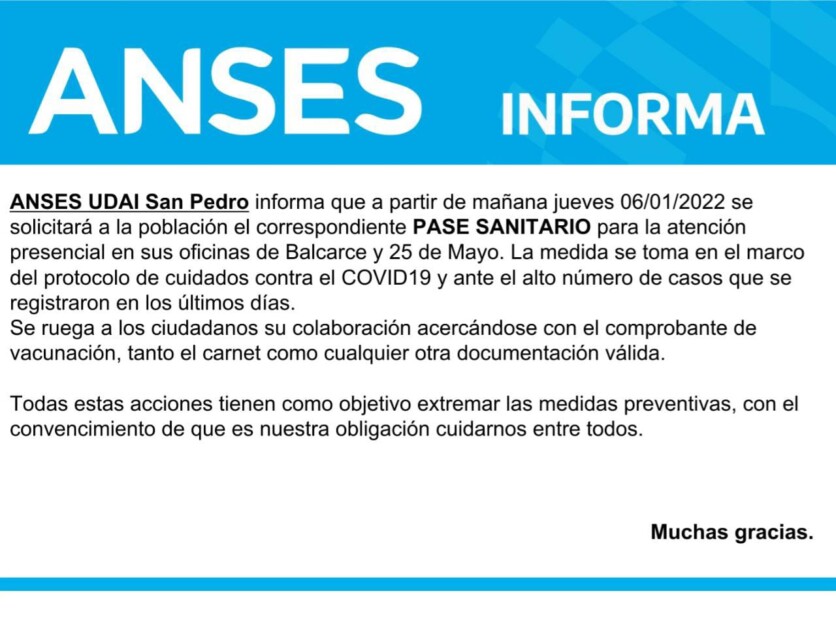 A partir del día de hoy el Anses San Pedro solicitará el pase sanitario para poder ingresar a realizar trámites.