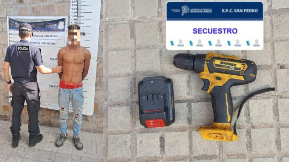 En el día de ayer, personal policial de la Comisaría de San Pedro logró la aprehensión en fuga de un delincuente de 28 años con frondosos antecedentes penales. El sujeto había ingresado momentos antes a la vivienda de su hermana, ubicada en calle Nieto de Torres y Cruz Roja, donde sustrajo un taladro a batería antes de emprender la huida.