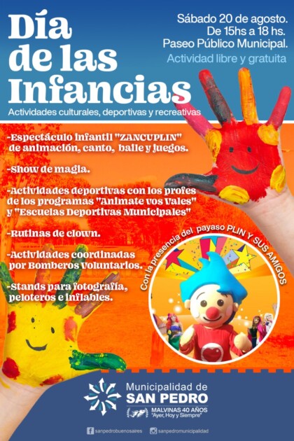La Municipalidad de San Pedro invita a participar de la celebración por el día de las infancias que se desarrollará este sábado 20 de agosto entre las 15 y las 18 hs. en el Paseo Público Municipal.