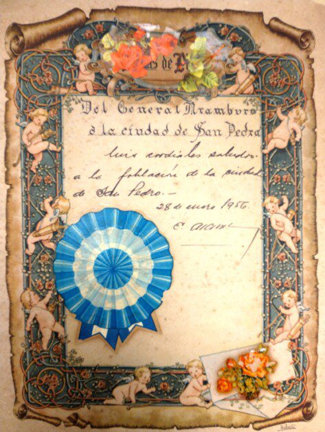 Dentro de los folios recibidos se destaca un saludo a la ciudad de San Pedro, fechado el 28 de enero de 1956, escrito y firmado de puño y letra por el entonces presidente de facto, Teniente General Pedro Eugenio Aramburu.