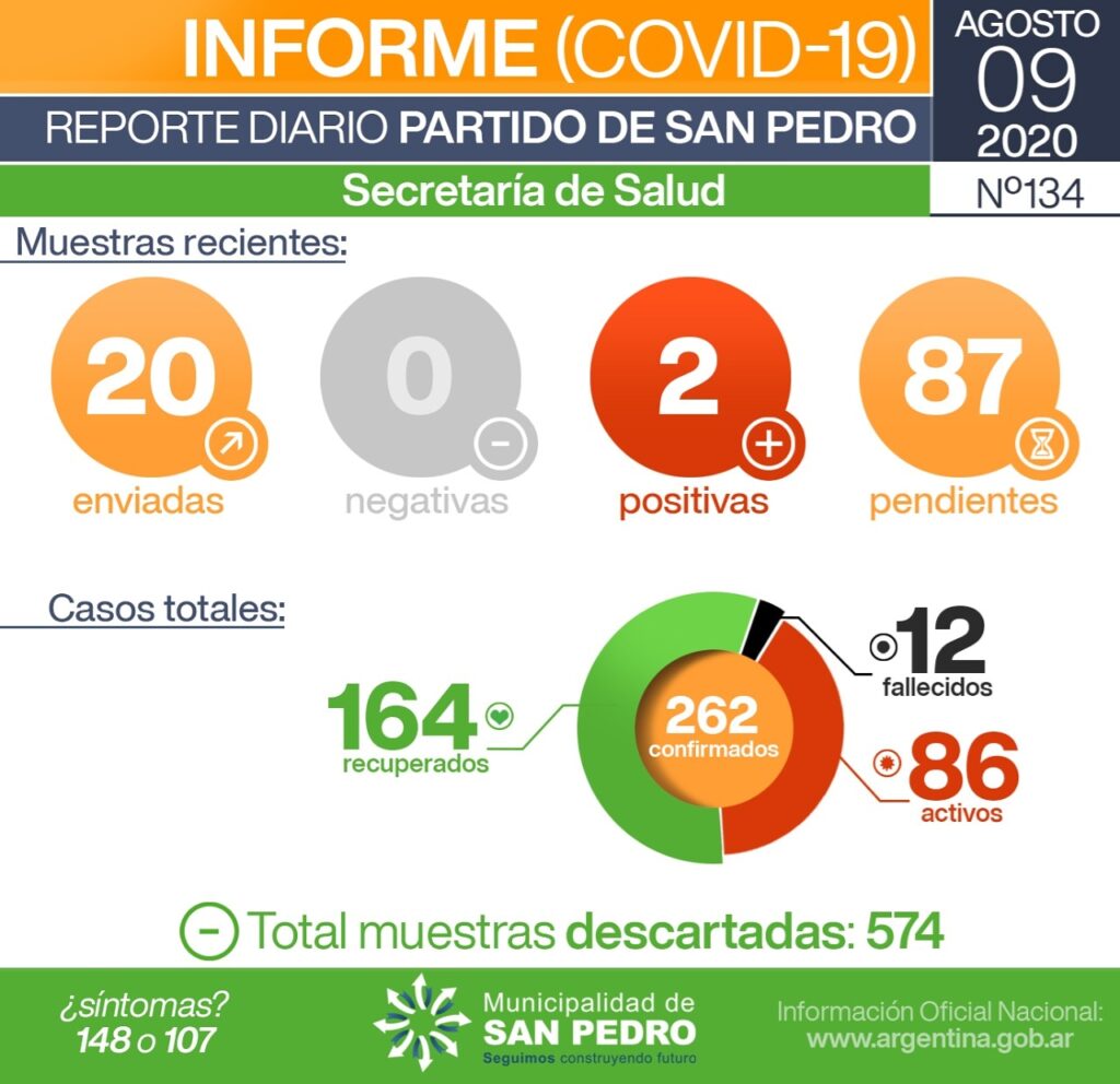 La Secretaría de Salud de la Municipalidad de San Pedro informa los datos recibidos y procesados en el seguimiento de la Pandemia de Covid-19. Hoy sólo con muestras recibidas desde laboratorio privado.