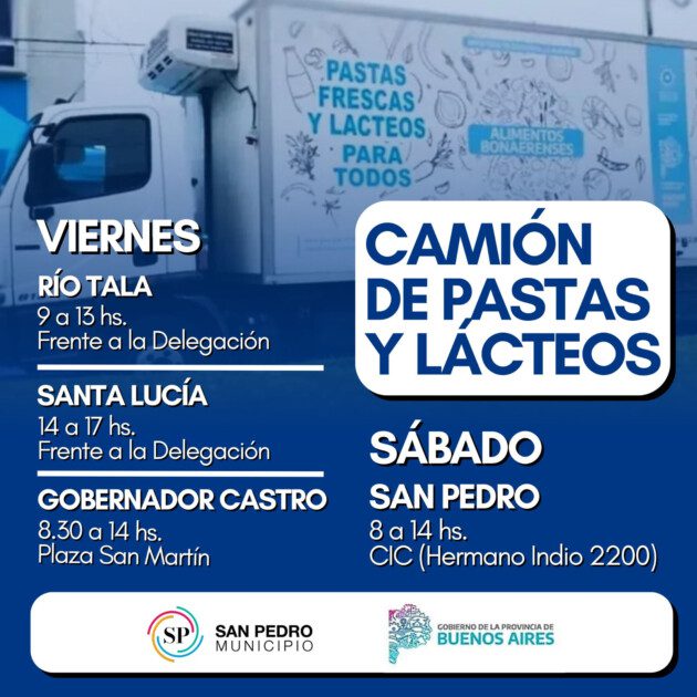 La Municipalidad de San Pedro, a través de la Secretaría de Producción, Industria y Comercio, informa que este viernes 13 de diciembre estarán disponibles dos camiones de Pastas y Lácteos en diferentes localidades, ofreciendo productos accesibles para los vecinos y vecinas.