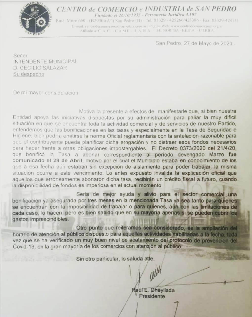 En la carta fechada el 27 del corriente se ratifica el apoyo de la entidad a todas las iniciativas dispuestas para enfrentar la actual situación de las empresas, comercios y prestadores de servicios ante la situación pero remarca que la bonificación otorgada para la Tasa de Seguridad e Higiene debería comunicarse «con la antelación razonable para que el contribuyente pueda planificar dicha erogación y no distraer esos fondos necesarios para hacer frente a otras obligaciones impostergables».