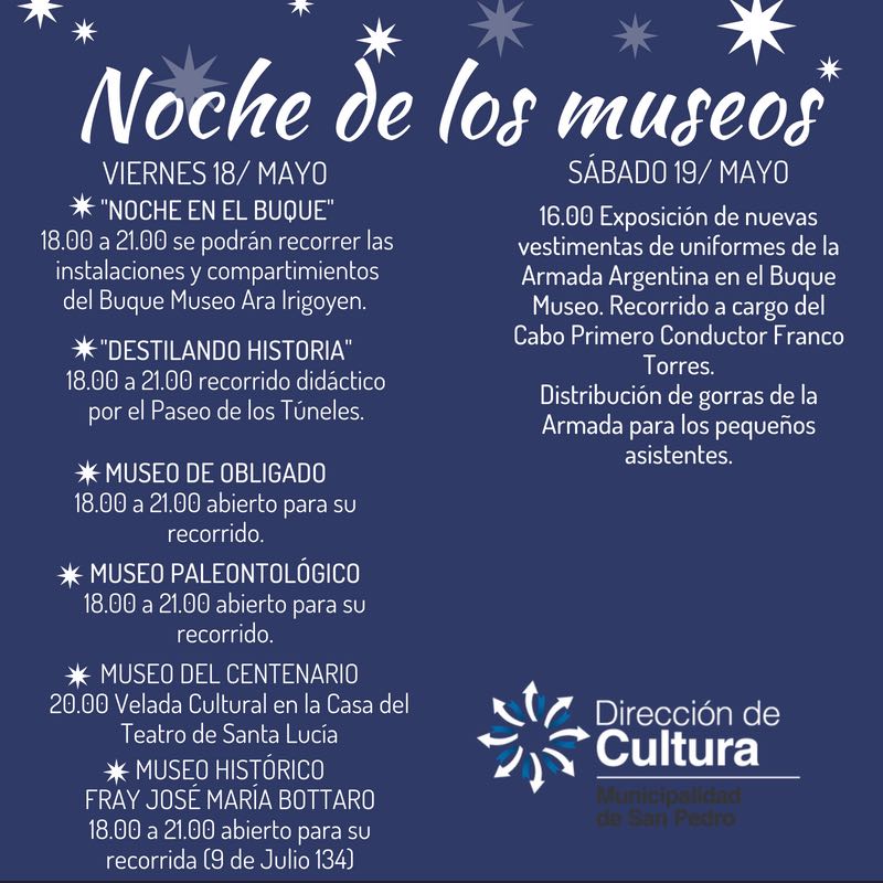 El Centro de Estudios Históricos de San Pedro adhiere a la iniciativa «Noche de los Museos» organizada por la Dirección de Cultura. En este marco, el Museo Histórico «Fray José María Bottaro» permanecerá abierto el próximo viernes 18 de mayo de 18 a 21 hs con ENTRADA LIBRE Y GRATUITA para sampedrinos y turistas.
