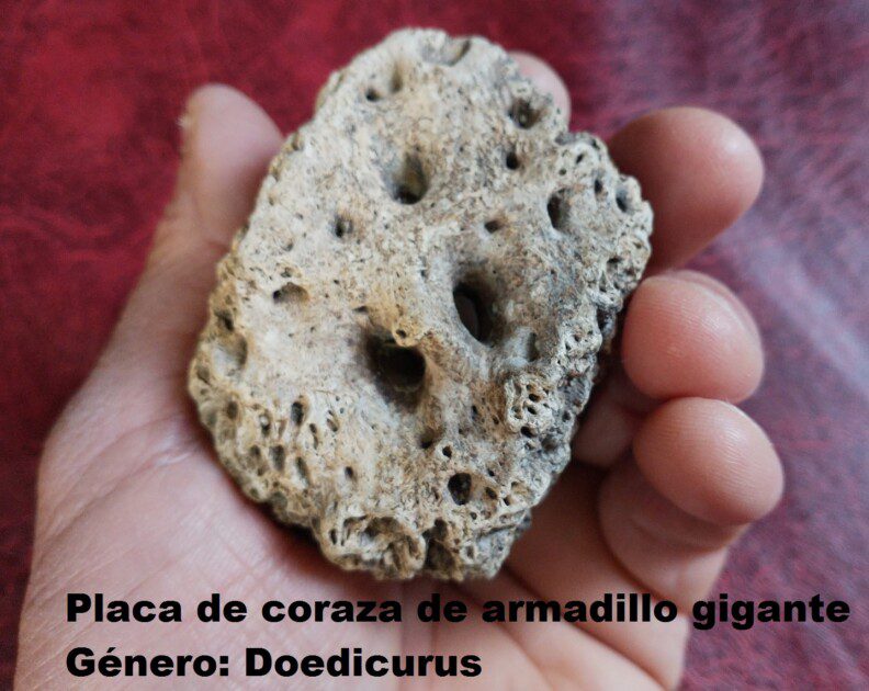 Por último, se recuperó una placa de coraza muy bien preservada perteneciente a un armadillo gigante fósil del género Doedicurus. Estos animales acorazados fueron mamíferos de gran porte cuyo peso superaba los 1.000 kilogramos y su cola poseía un “mazo” muy robusto con púas en su superficie, que le permitía defenderse de sus atacantes.