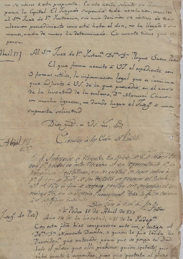 El caso se consultó con el Juzgado de Primera Instancia, a cargo del Dr. Roque Sáenz Peña, a quien se expresa “El que firma remite a Ud. el espediente con 3 fojas útiles, la información legal que es la misma que adjunto a Ud. de la que procedió, en el caso de la esclava, Don Manuel Chacón con mucha ligeresa, no dando lugar el juzgado a una supuesta solicitud…”