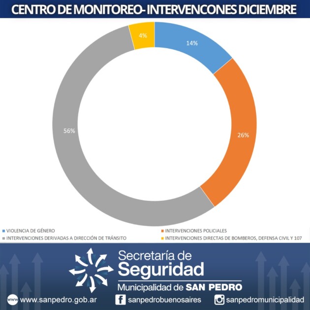 En cuanto a las intervenciones llevadas a cabo por el Centro de Monitoreo, en un total de 145 eventos, un 56% fueron derivadas a la Dirección de Tránsito por ruidos molestos, mal estacionamiento, comercios sin habilitación y equinos sueltos, en un 26% se dio intervención a la Policía por robo, hurto, asaltos, alarmas o disturbios, un 14% fueron incidentes de violencia de género y un 4% intervenciones directas de Bomberos, Defensa Civil y 107.