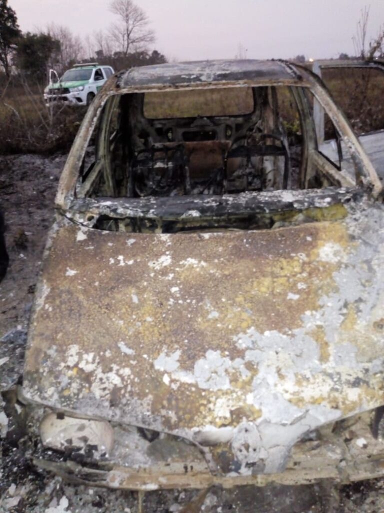 En la tarde de hoy inspectores de transito que estaban buscando unos caballos sueltos en zona rural en cercanías de la perrera local ubicada sobre Lucio Mansilla dieron de casualidad con este automóvil abandonado y prendido fuego.