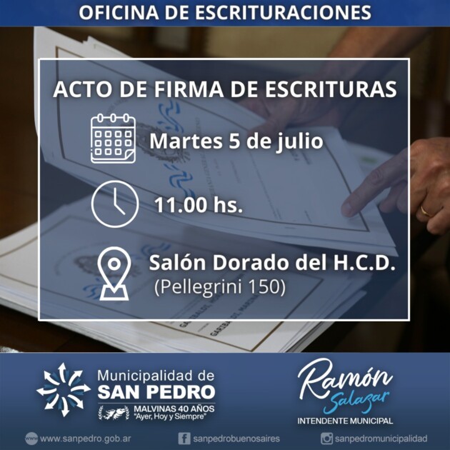 La Oficina de Escrituraciones de la Municipalidad de San Pedro, informa que el próximo martes 5 de julio a las 11.00 hs. se concretará un nuevo acto de firma de escrituras gestionadas a través del área y continuando con el constante plan de regularización dominial “Mi Escritura Mi Casa” que se lleva adelante junto a la Escribanía General de Gobierno dependiente del Ministerio de Justicia y Derechos Humanos de la Provincia de Buenos Aires. En esta oportunidad se firmarán 88 escrituras pertenecientes a diferentes vecinos del Partido en un acto que se desarrollará en el Salón dorado del Honorable Concejo Deliberante (Pellegrini 150).