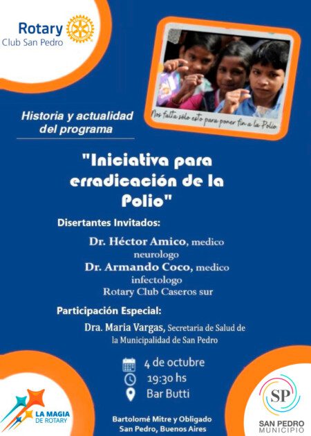 La Municipalidad de San Pedro invita a la comunidad a participar en el evento titulado “Iniciativa para Erradicación de la Polio”, que se llevará a cabo el viernes 4 de octubre a las 19:30 horas en el Bar Butti, ubicado en Mitre y Obligado.