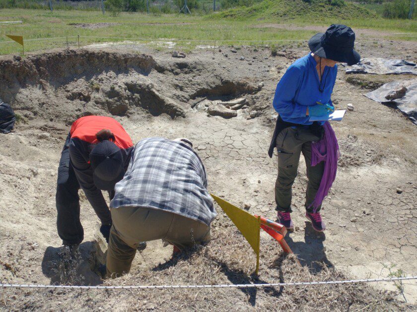 Los científicos fueron recibidos por José Luis Aguilar, Augusto Moleón y Julio Simonini, integrantes del Museo Paleontológico de San Pedro.En la jornada se tomaron muestras sedimentológicas en el yacimiento de Bajo del Tala con la finalidad de obtener dataciones certeras de los niveles fosilíferos que investiga el grupo del museo local desde hace más de veinte años.