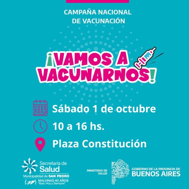 La Secretaría de Salud de la Municipalidad de San Pedro informa que este sábado 1 de octubre iniciará la Campaña Nacional de Vacunación contra Sarampión, Rubéola, Paperas y Poliomielitis en Plaza Constitución de 10 a 16 hs.