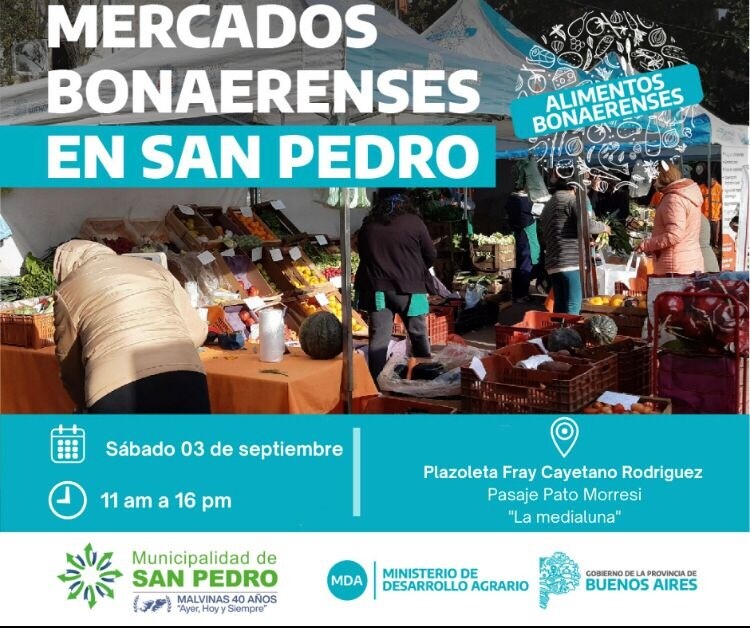 Se acerca una nueva edición de Mercados Bonaerenses, la actividad que lleva a cabo el Ministerio Desarrollo Agrario, junto a la Municipalidad de San Pedro, coordinada por la Secretaría de Desarrollo Económico se desarrollará el Sábado 3 de septiembre en la Plazoleta Fray Cayetano Rodríguez de 11 a 16 hs.