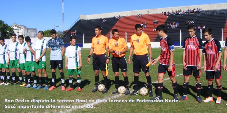 Un gran triunfo obtuvo el selectivo de la Liga Sampedrina ante su par de Rojas en el partido de ida, primera final, del torneo nacional Sub 15 que organiza AFA y coordina en su primera etapa Federación Norte de Fútbol. Los goles de San Pedro fueron convertidos por Oliveto en dos ocasiones, Arnal y Núñez, mientras que para la visita lo marcó su goleador Forgués. Fue árbitro Luis Flores, quien sobre el final expulsó por doble amonestación a Nicolás Domínguez del local.