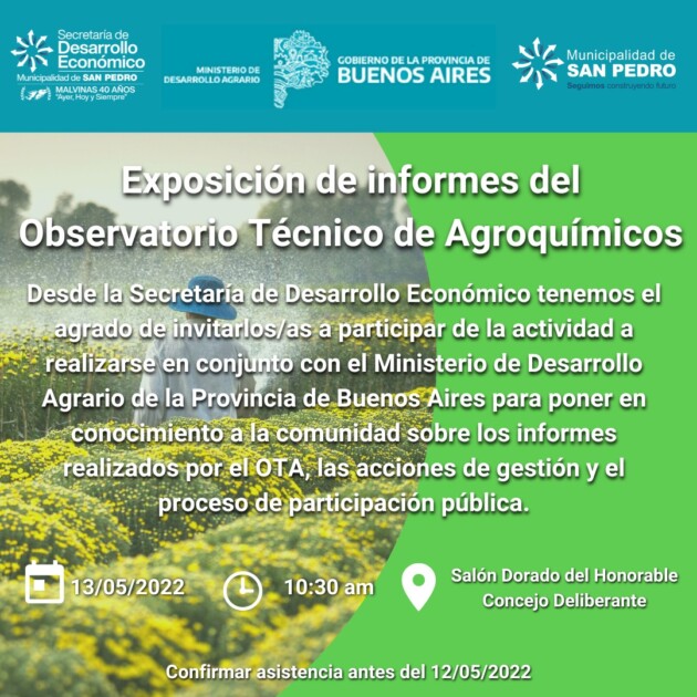 La Municipalidad de San Pedro, a través de la Secretaría de Desarrollo Económico invita a participar de la exposición de informes que se realizará el viernes 13 de mayo a las 10.30 hs en el Salón Dorado del Honorable Concejo Deliberante.