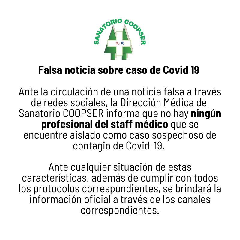 Ante la circulación de una noticia falsa a través de redes sociales, la Dirección Médica del Sanatorio COOPSER informa que no hay ningún profesional del staff médico que se encuentre aislado como caso sospechoso de contagio de Covid-19.