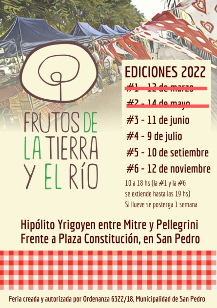 El sábado 11 de junio se concretará una nueva edición de Frutos de la tierra y el río, consolidando el cronograma planteado a principios de año. Ésta vez la convocatoria es honrar al medioambiente y por eso se recuerda a quienes asistan, la importancia de llevar las bolsas propias reciclables para hacer un pequeño aporte a su cuidado. La feria será entre las 10 y 18 hs, frente a la Plaza Constitución.