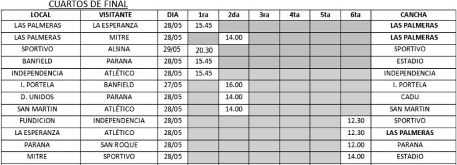Sexta división: La Esperanza vs. Atlético, Fundición vs. Independencia, Paraná vs. San Roque y Mitre vs. Sportivo.