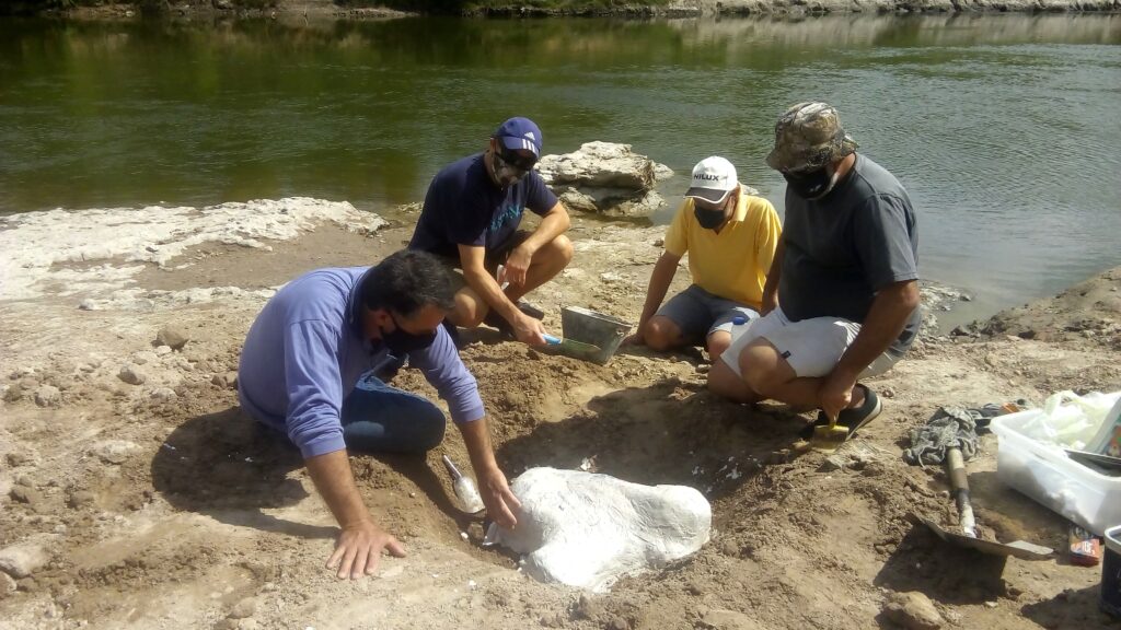 Gustavo Martínez, Daniela Martínez y su esposo, Misael Alí (el primero en ver los fósiles), observaron algo que llamó su atención semienterrado en una capa de sedimentos aflorantes a la vera del río. De inmediato, la tarde de pesca en familia se convirtió en una aventura que los transportó a la prehistoria de la zona. Enseguida dieron aviso al Museo Paleontológico de San Pedro y un equipo conformado por José Luis Aguilar, Javier Saucedo, Matías Swistun y Walter Parra, acudieron al llamado en representación del Grupo Conservacionista de Fósiles.